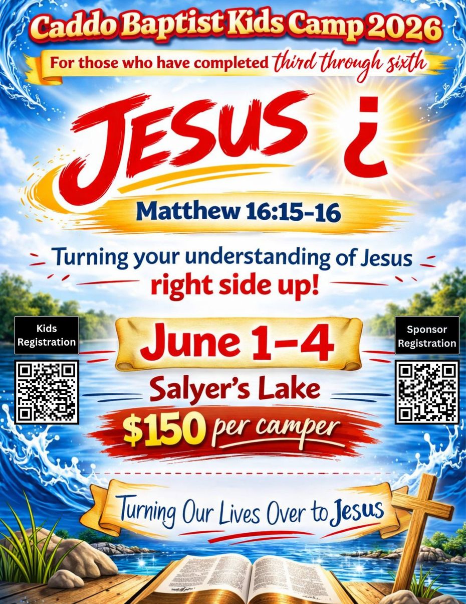 June 1-4: Children’s Camp ($150 per person / Salyers Lake) Camp will start Monday at noon. Arrival will be from 8:30-11:30 on Monday. Campers will head home Thursday after breakfast and last camp meeting. To ensure a safe environment for all children during camp, a copy of each background check must be turned into the association in advance or brought to camp on Monday for verification.