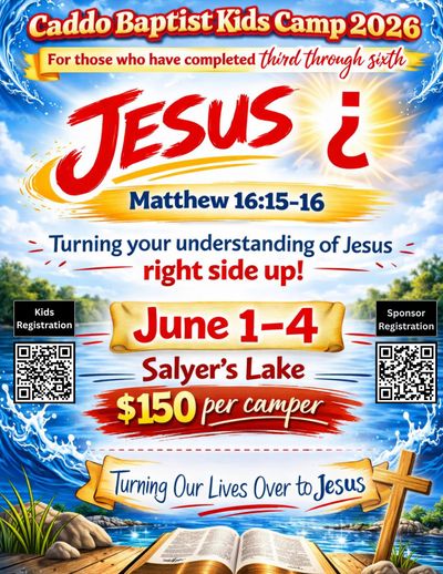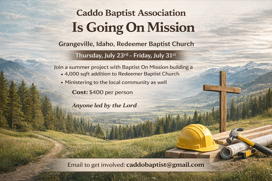 The Caddo Baptist Association is a cooperating body of local Southern Baptist churches existing for the purpose of glorifying God by enabling each church to fulfill its unique mission for Christ and by providing channels for cooperative ministry."