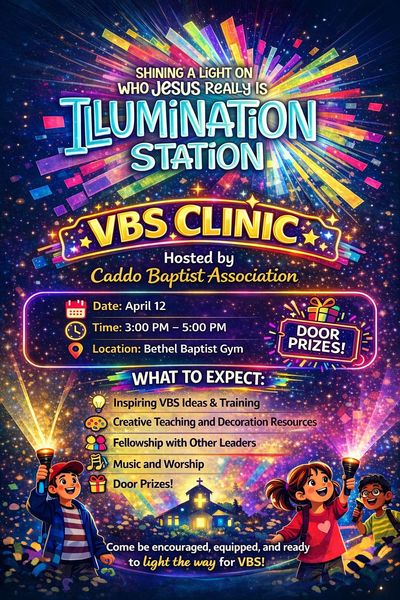 April 12 - CBA VBS Clinic: 3:00-5:00 pm. at Bethel Baptist Church. VBS training with ideas and resources for music, teaching, decorations, Bible study, crafts, snacks (door prizes).
