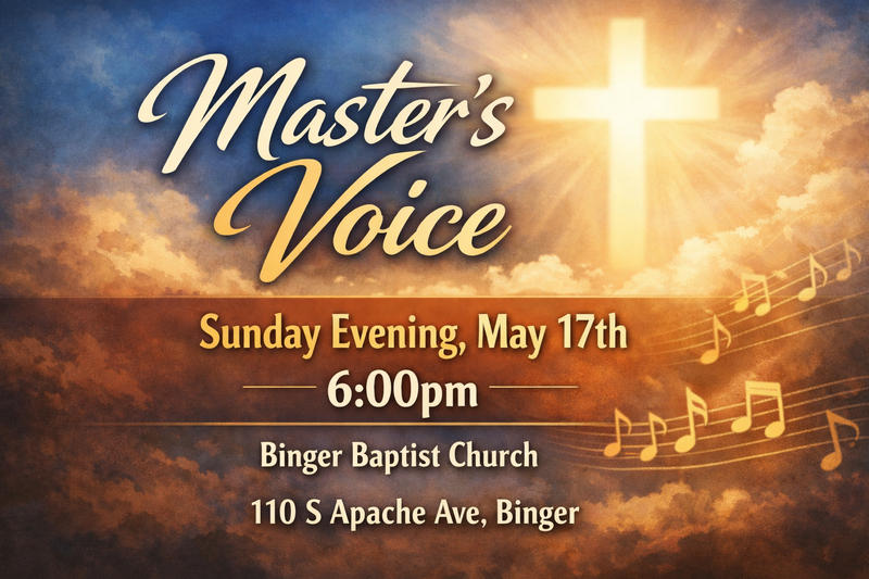 May 9 – Women & The Word (4:00-6:00 pm) at Binger Baptist Church. A time of fellowship and building relationships over dinner, worship (Melissa McConnell), and message (Shannon Robinson).