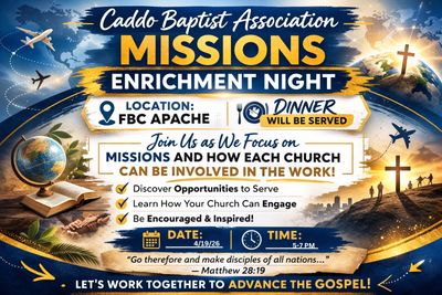 April 19 - Missions Enrichment: 5:00-7:30 pm. at FBC Apache. Join us for dinner as we focus on missions and how each church can be involved in the work! Speakers will share from everything on evangelism on the home front, supporting mission work, to how to prepare your church for a mission trip.
