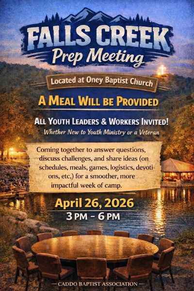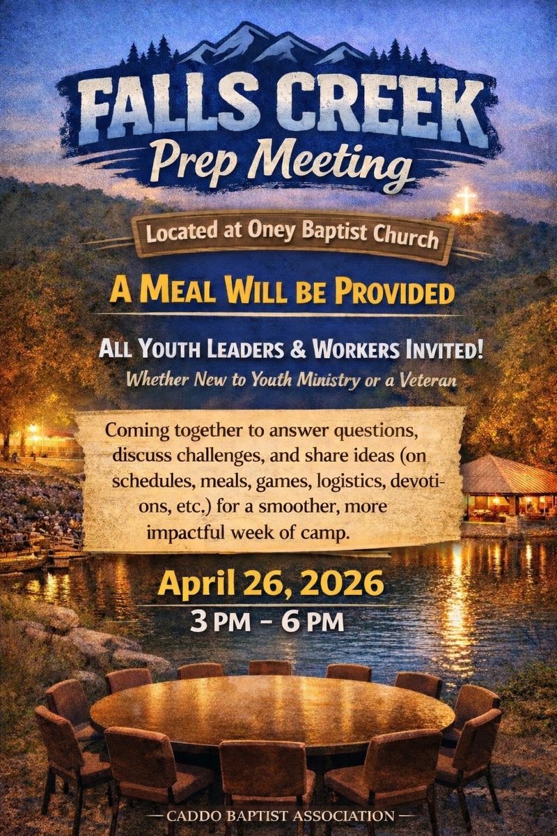 April 26 - Falls Creek Prep Meeting: 3:00-6:00 pm. at Oney Baptist Church. All youth leaders/workers are invited to dinner and a time to answer questions, discuss challenges, and share ideas to prepare for a smoother, more impactful week of camp.